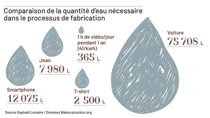 Éric suit de près les travaux et articles de Raphaël Lemaire, basés entre autres sur des indicateurs environnementaux comme l’empreinte en eau et celle des matières premières. Ils montrent les impacts considérables des matériels numériques sur les ressources :